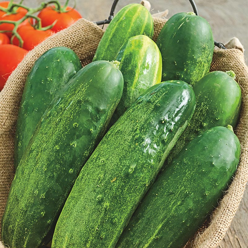 Dark green cukes, 10-12 in. long, have thin skin and size up fast.